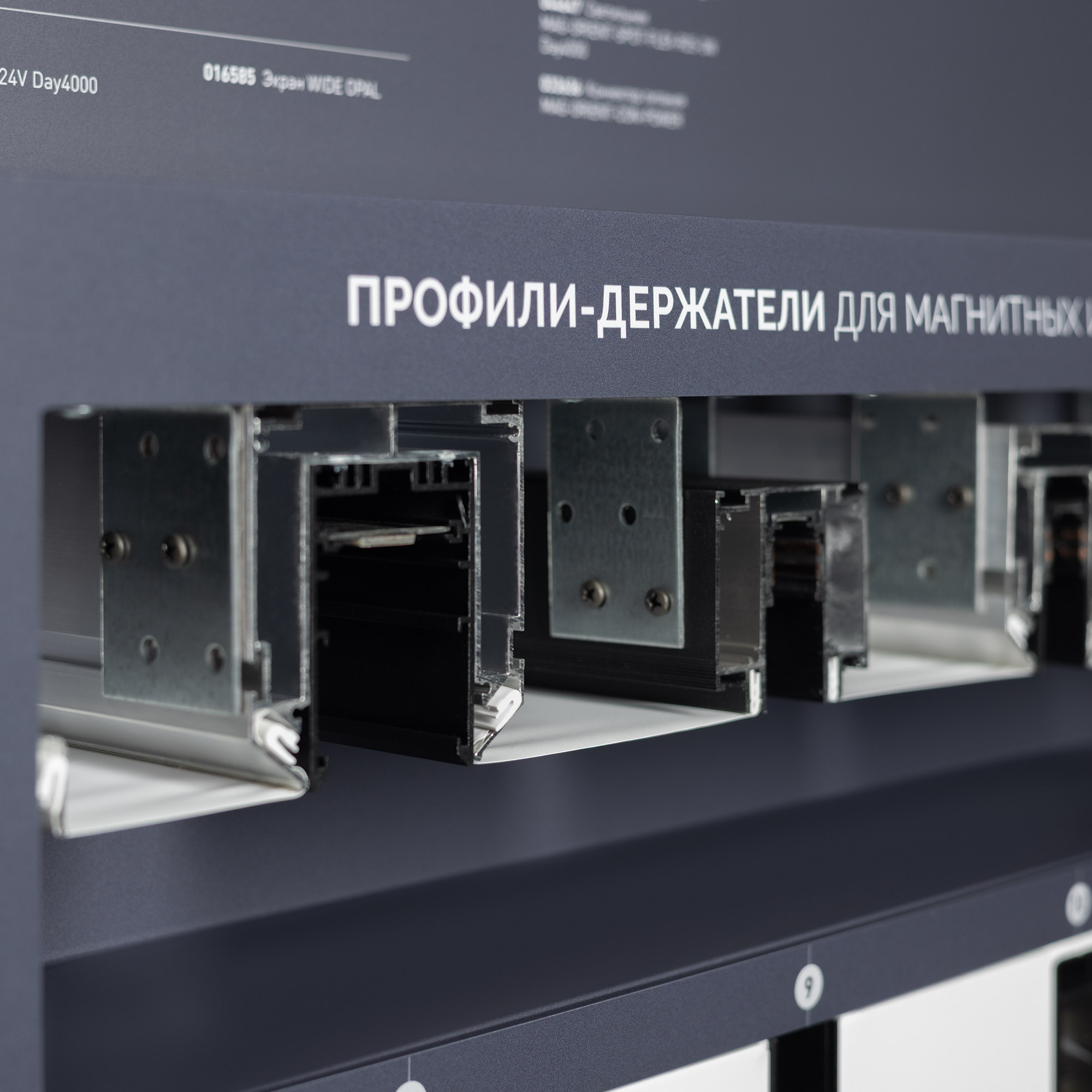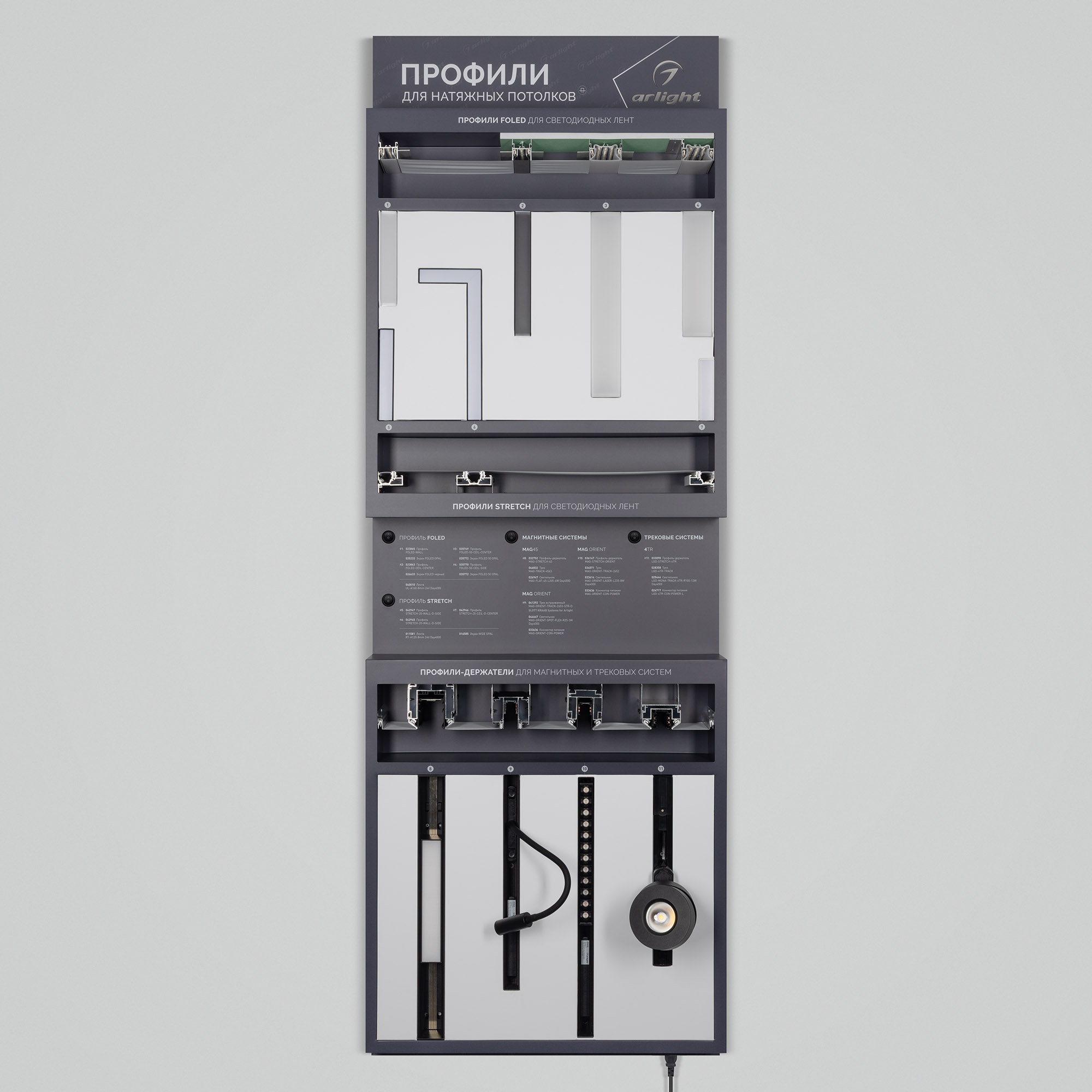 На стенде представлен ассортимент профилей Arlight для натяжных потолков: Профиль серии FOLED, совмещающий в своей конструкции каркас для крепления натяжного потолка и профиль для установки светодиодной ленты. Профиль-держатель MAG STRETCH для установки магнитных треков в натяжной потолок. Материал корпуса стенда - алюкобонд 3 мм, пленка, печать.