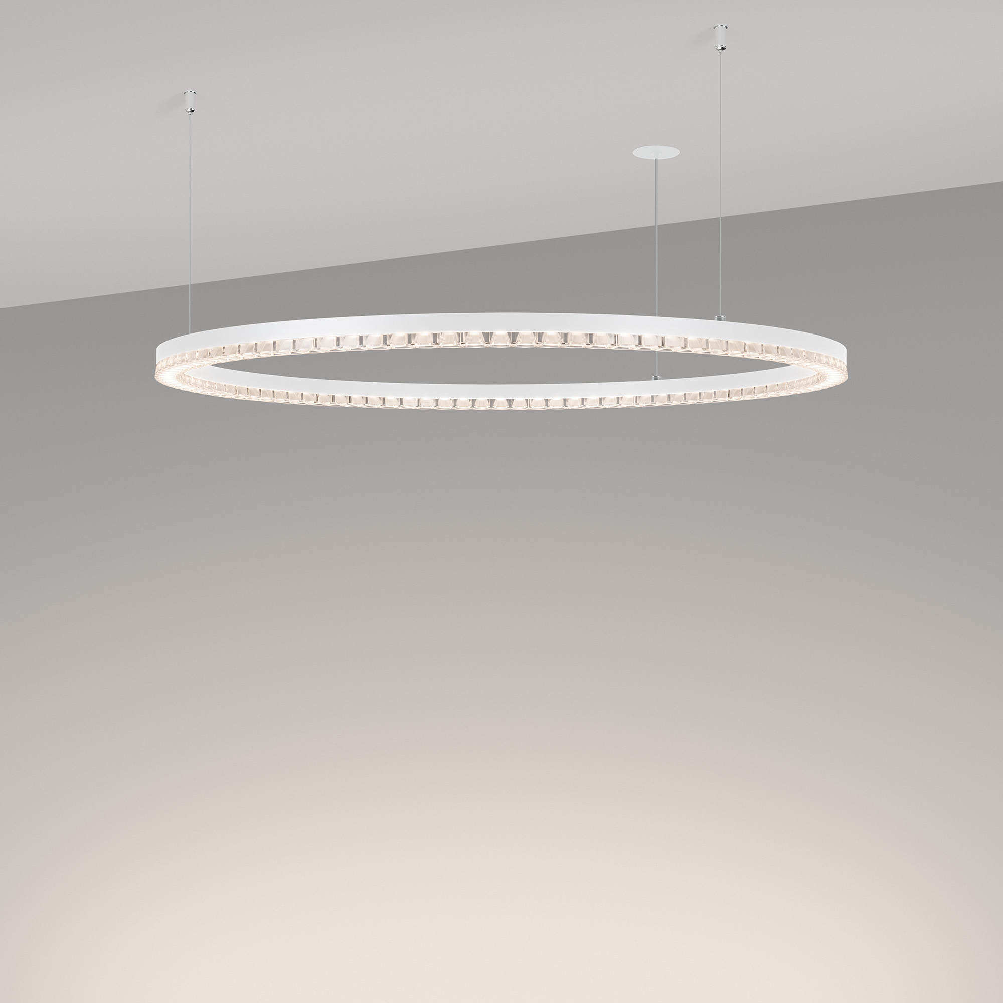 Под заказ. Подвесной светильник. Мощность 40 Вт, св. поток 3460 лм, 80-95 лм/Вт, дневной белый 4000 K, CRI>90, угол 45°, напряжение питания 230 В. Белый круглый корпус из алюминия, экран PMMA, степень защиты IP20. Размер: диаметр 850 мм, высота 34мм, ширина профиля 30 мм, размер чаши: диаметр 65 мм, высота 26 мм. Монтаж подвесной, длина подвеса 1200 мм, тип чаши встраиваемый, диаметр установочного отверстия чаши 60 мм. Драйвер 27-38 В, 1050 мА. Пульсация <0.3 %.
