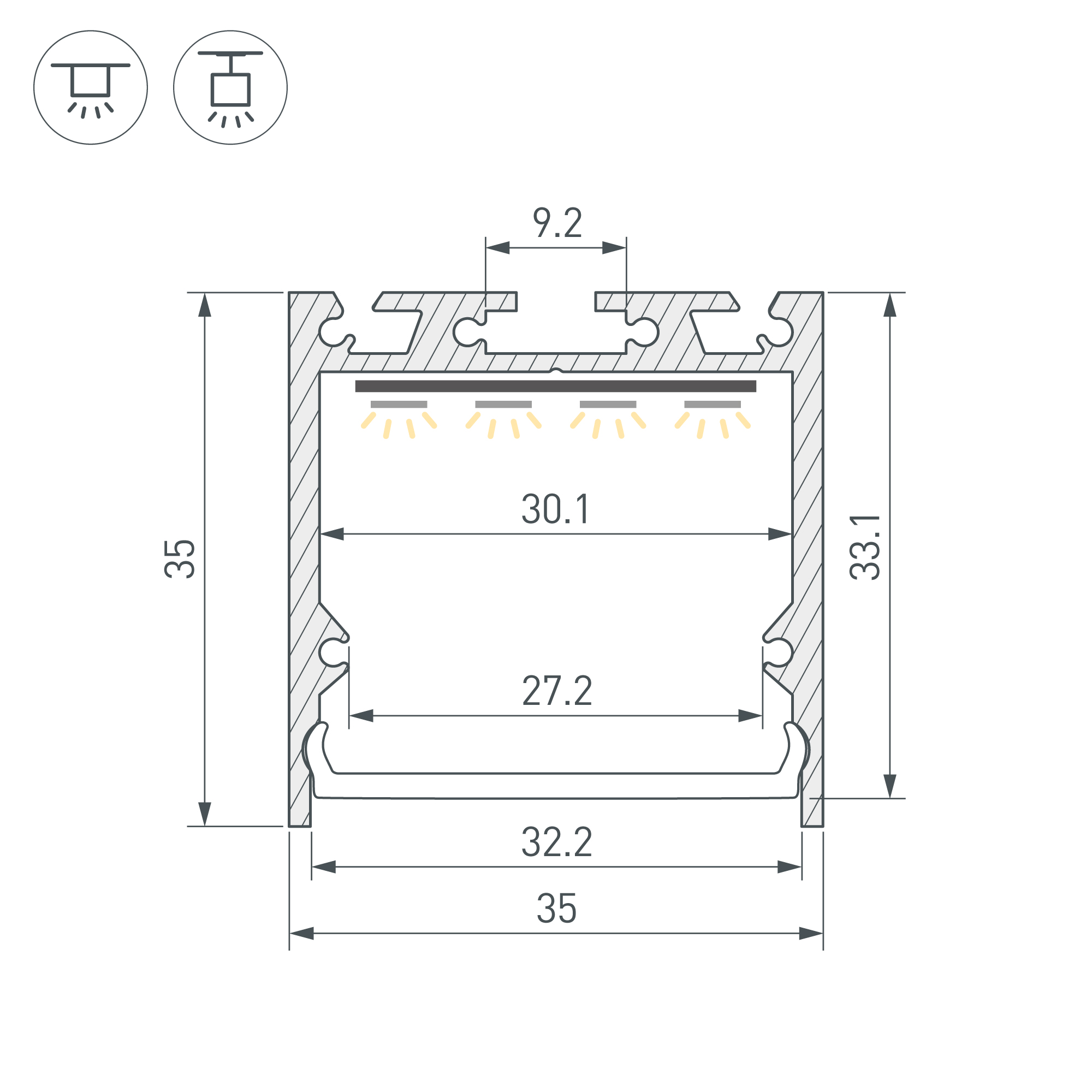 Алюминиевый анодированный профиль для светодиодных лент и линеек. Габаритные размеры (L×W×H): 2000x35x35 мм. Ширина площадки для ленты 30,1 мм. Экраны, заглушки и другие аксессуары приобретаются отдельно. Цена за 1 метр.