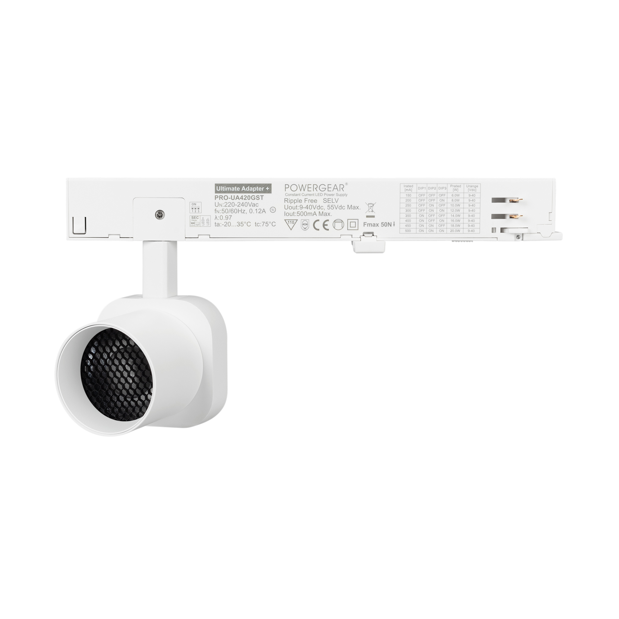 Светильник для треков/шин 4 провода. Мощность 10 Вт, св. поток 860 лм, 86 лм/Вт, дневной 4000 K, CRI>95, угол 38°, напряжение питания 230 В. Решетка HONEYCOMB в комплекте. Белый квадратный корпус из алюминия, материал линзы PC поликарбонат, степень защиты IP20. Размер световой части 60х60х62 мм. Монтаж на трек 3-фазный. Драйвер встроенный 9-40 В, 250мА., пульсация <1%
