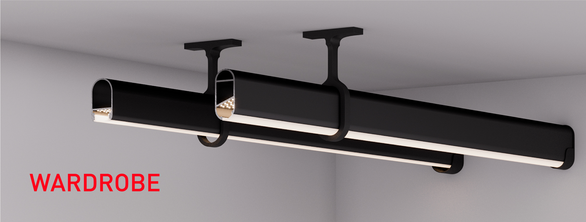 Профиль-штанга WARDROBE поможет решить сразу две задачи. С ним легко организовать освещение в шкафу или гардеробной. Кроме того, его можно использовать для компактного хранения одежды.