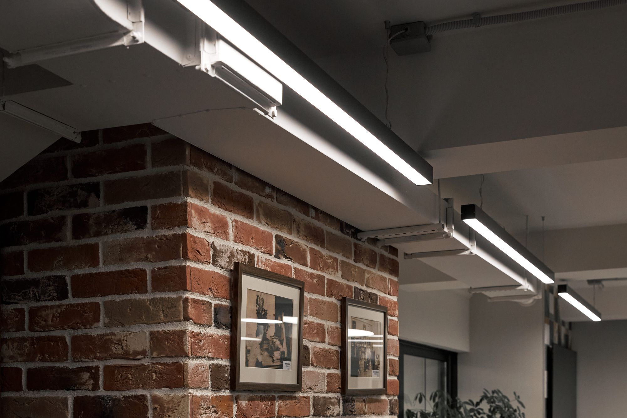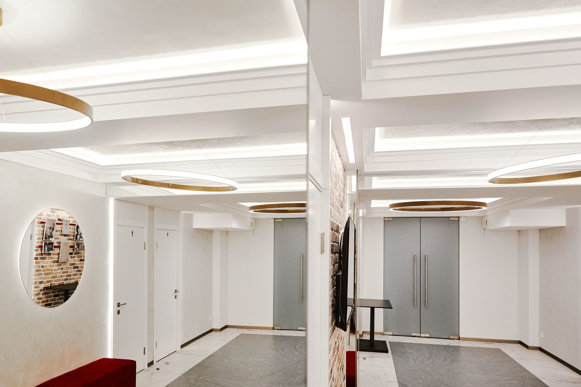 В отличие от танцевальной студии, подвесные линии света выполнены в более легком белом цвете. Расположенные в форме решетки, они словно являются продолжением потолочных перекрытий.