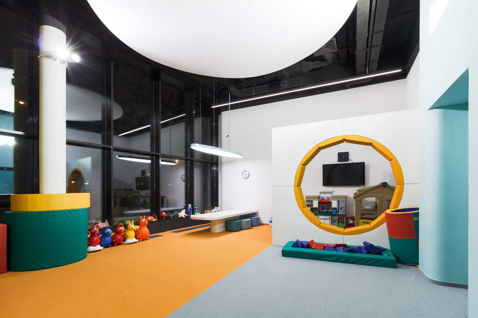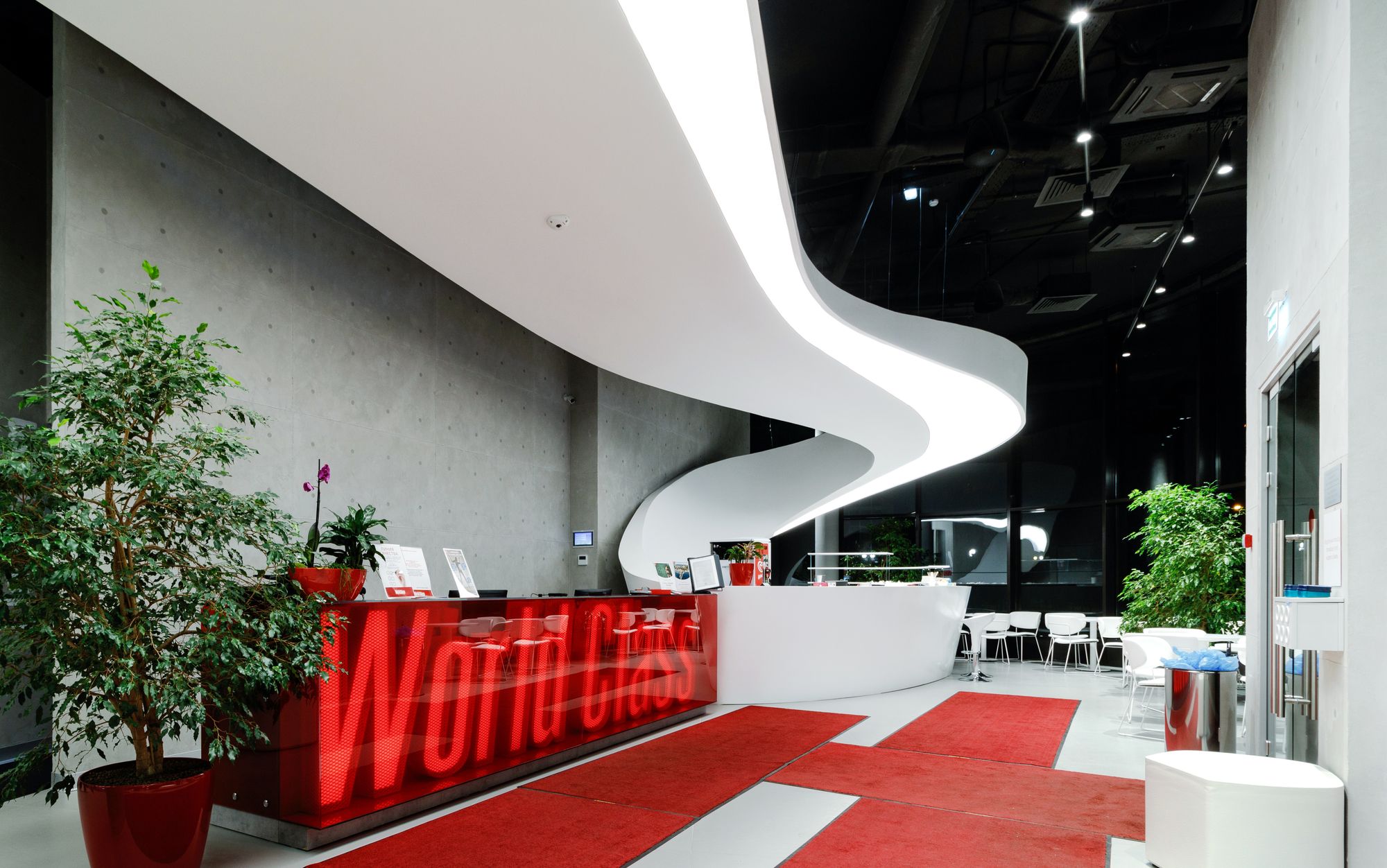 Световой дизайн построен на контрасте белого и красного, широких световых полос и тонких линий света. Линейные светильники с полупрозрачными экранами идеальны для основного освещения. Декоративная подсветка зеркал и других элементов интерьера выполнена светодиодными лентами дневного белого свечения. Границы потолка и стен в фитнес-зонах эффектно подчеркнуты линиями света.