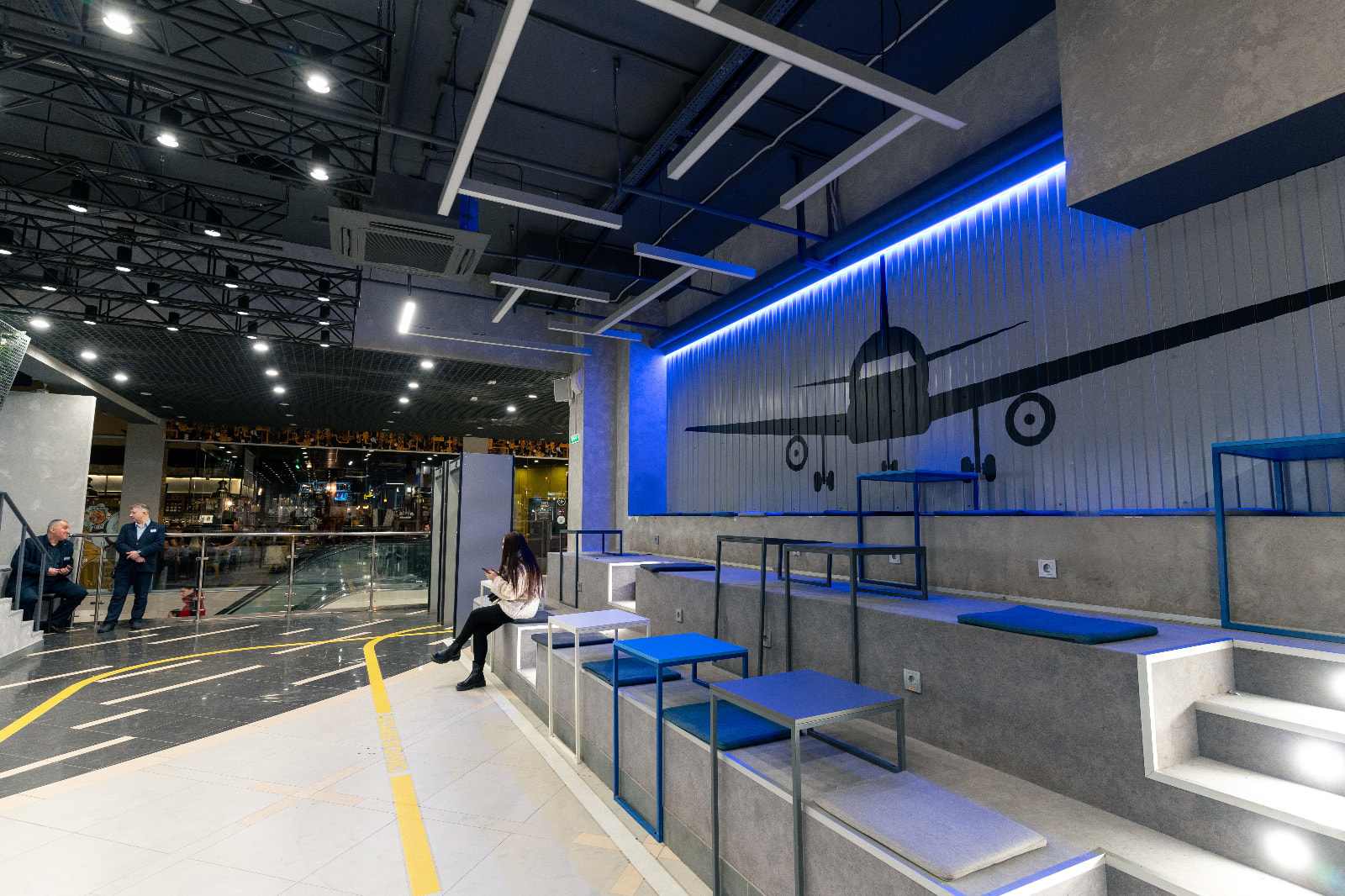 Многие пространства фудкорта идеально подходят в качестве эффектных фотозон. К примеру, зона, огороженная желтой ширмой, привлекает гостей торгового центра не только уютным расположением и креслами, стилизованными под тележки для багажа, но и стильной неоновой надписью. Еще одна оригинальная локация — двухуровневый подиум, позади которого размещено монохромное изображение самолета, подсвеченное лентой с синим свечением.