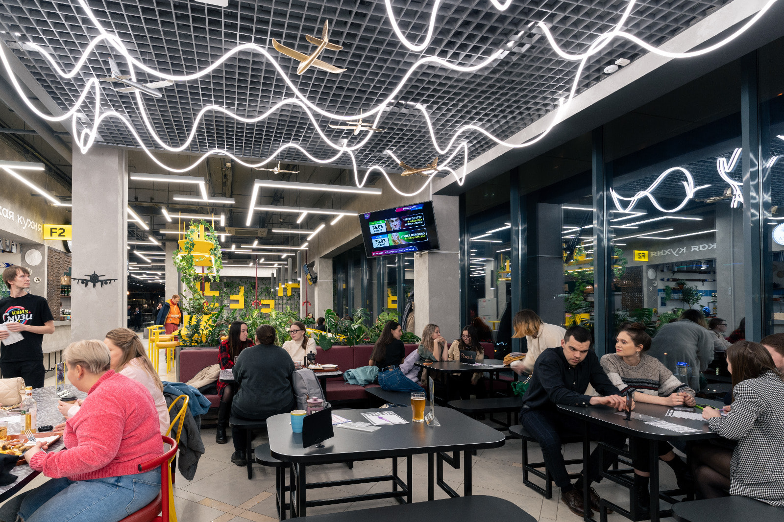 Основное освещение фудкорта выполнено в дневном белом цвете (4000 К): свечение с такой цветовой температурой отличается умеренной строгостью и помогает сконцентрироваться, благодаря чему его часто используют в аэропортах. Помимо подвесных линейных светильников, для освещения зала был применен гибкий неон: волнообразные линии света, парящие в воздухе и похожие на облака, и кружащиеся среди них небольшие самолетики создают эффектную и трогательную композицию.