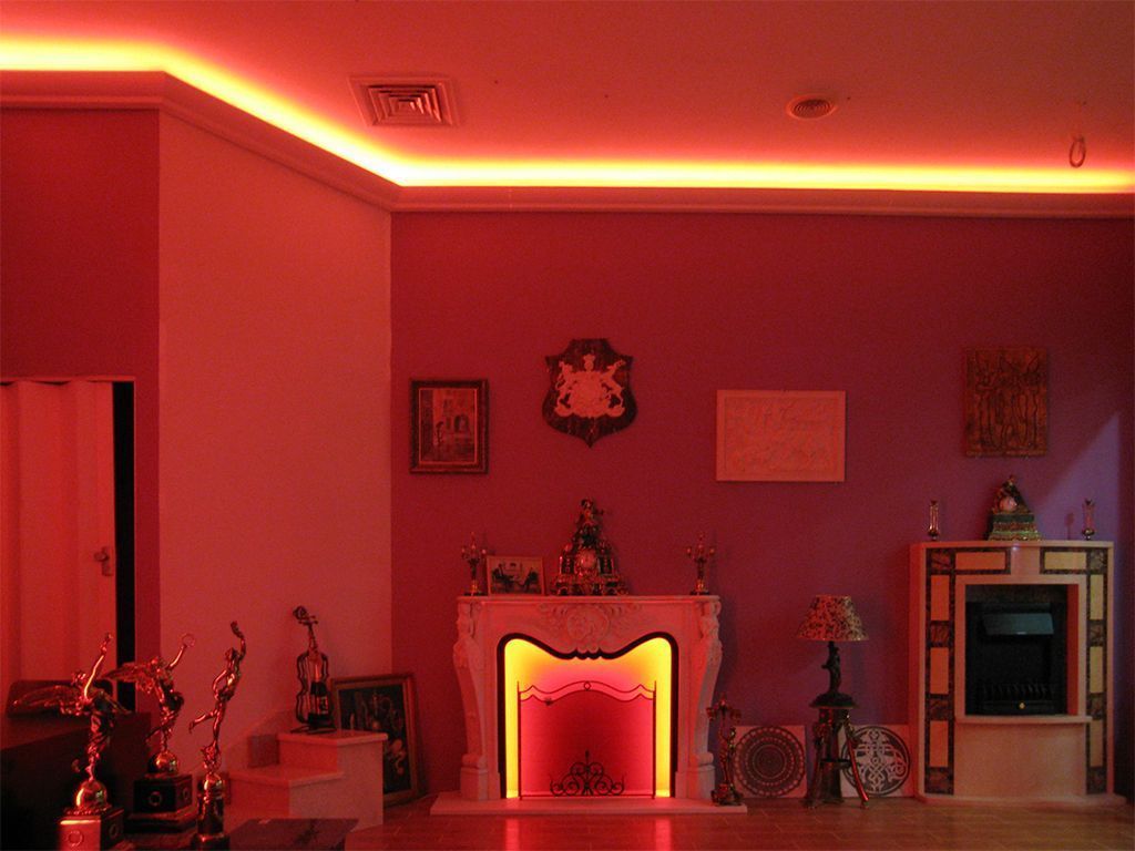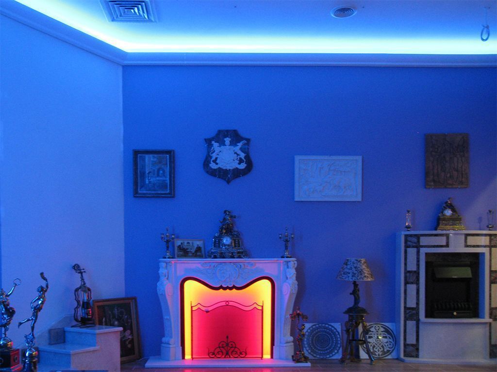 Используя многозонный пульт ДУ, изменять цвет можно в нескольких зонах как одновременно, так и независимо друг от друга, что позволяет добиться интересных цветовых сочетаний. Это можно увидеть на одном из примеров, в котором светодиодная подсветка декоративного камина включена в красном цвете, а подсветка карниза по периметру комнаты - в синем.
