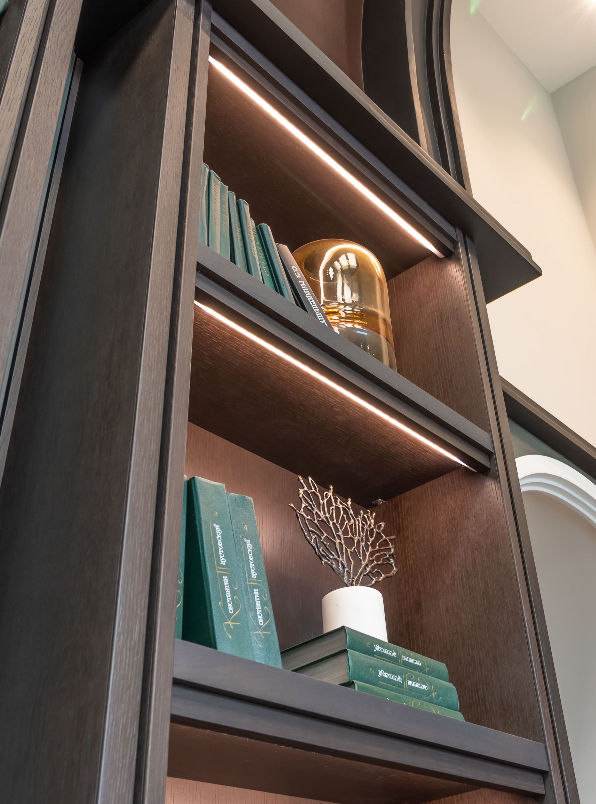 Шкафы и полки создают в лобби уютную и домашнюю атмосферу, поэтому и подсветка для них была выбрана соответствующая — с теплым белым свечением (3000 К).